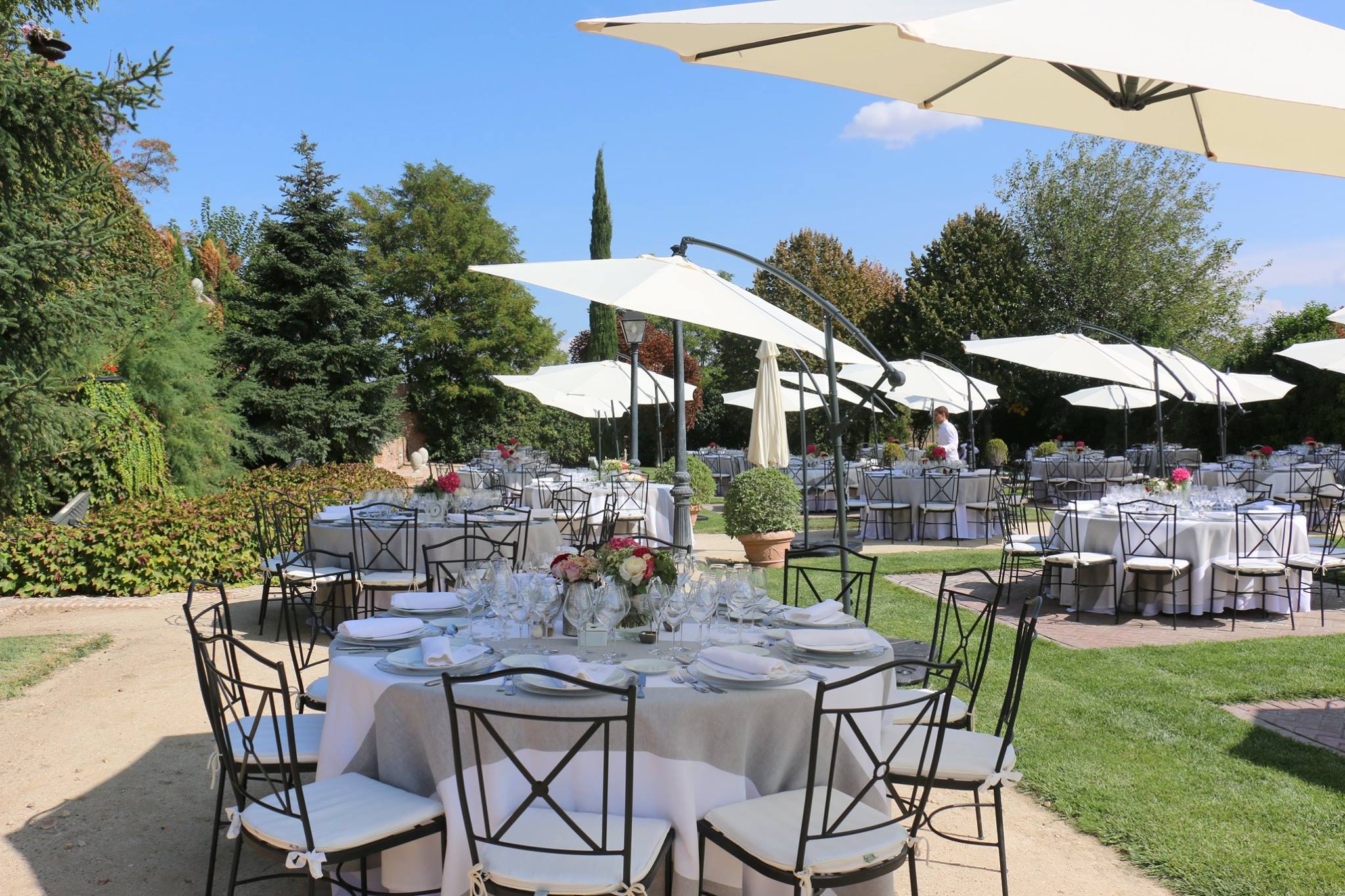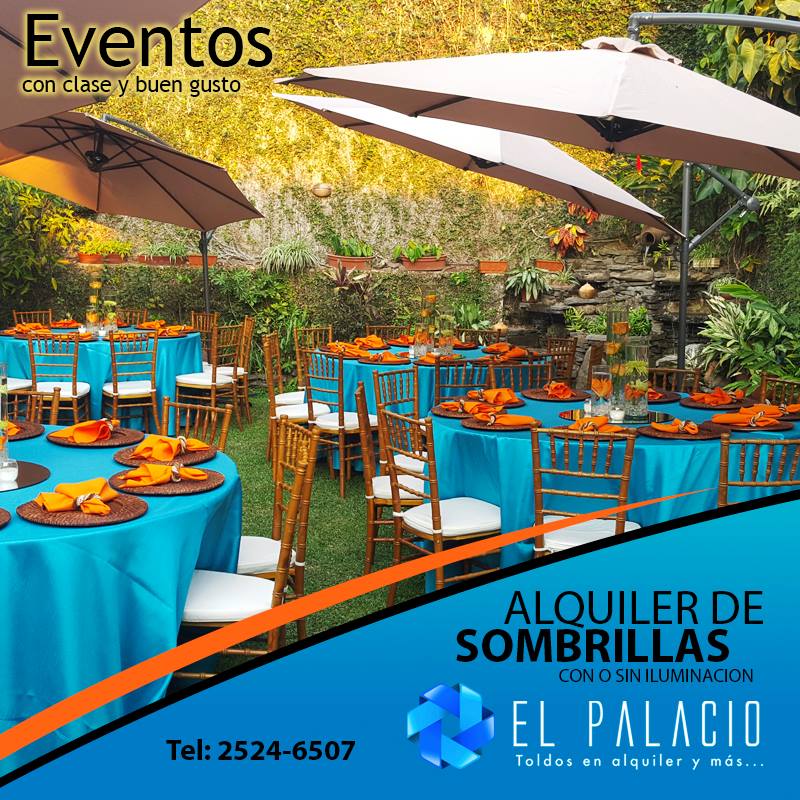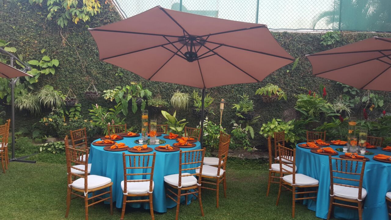 Evita el sol en tus eventos al aire libre, nuestras sombrillas son elegantes y cubren perfectamente una mesa con 10 personas.